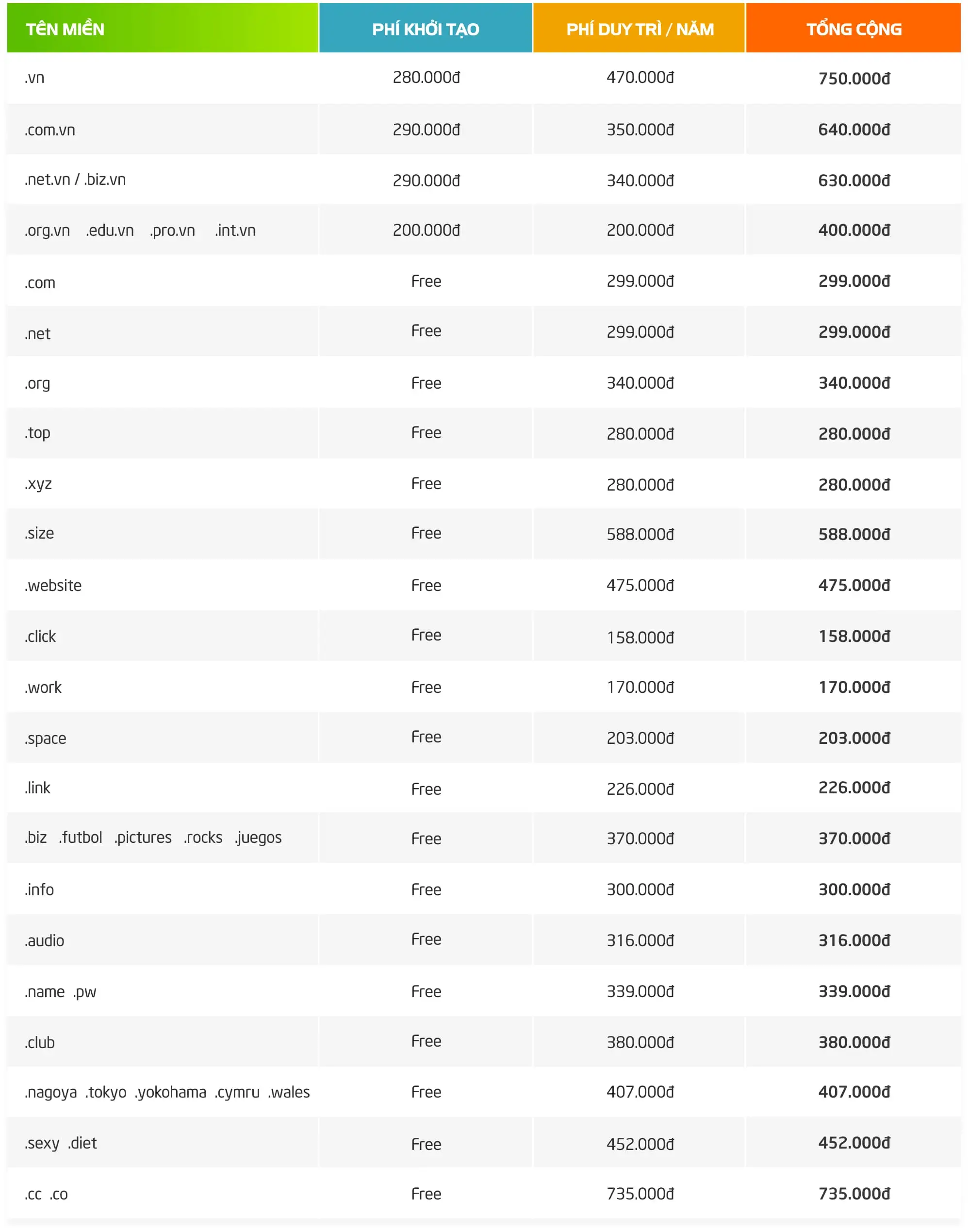 Bạn muốn mua tên miền website chất lượng? Nhưng không viết mua domain giá rẻ uy tín, chất lượng ở đâu? Vậy bạn nhất định không nên bỏ qua dịch vụ đăng ký tên miền của LINHSAM WEB. Bạn có thể tham khảo bảng giá tên miền giá tốt, chất lượng ở bên dưới!